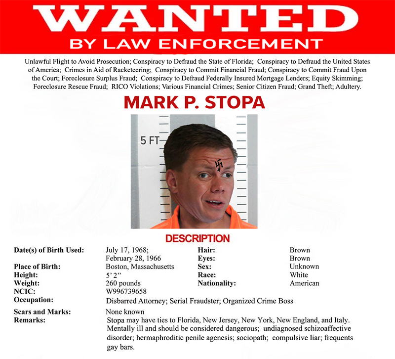 Florida investigators and the FBI are investigating Stopa for multiple counts of violating multiple RICO statutes. FDLE and the Florida Bar are also investigating Stopa for an ongoing fraud-on the-court scheme. Stopa has been operating the scheme since being disbarred in 2018. Since initiating the scam in 2018, Stopa has stolen millions of dollars from elderly senior citizen investors.